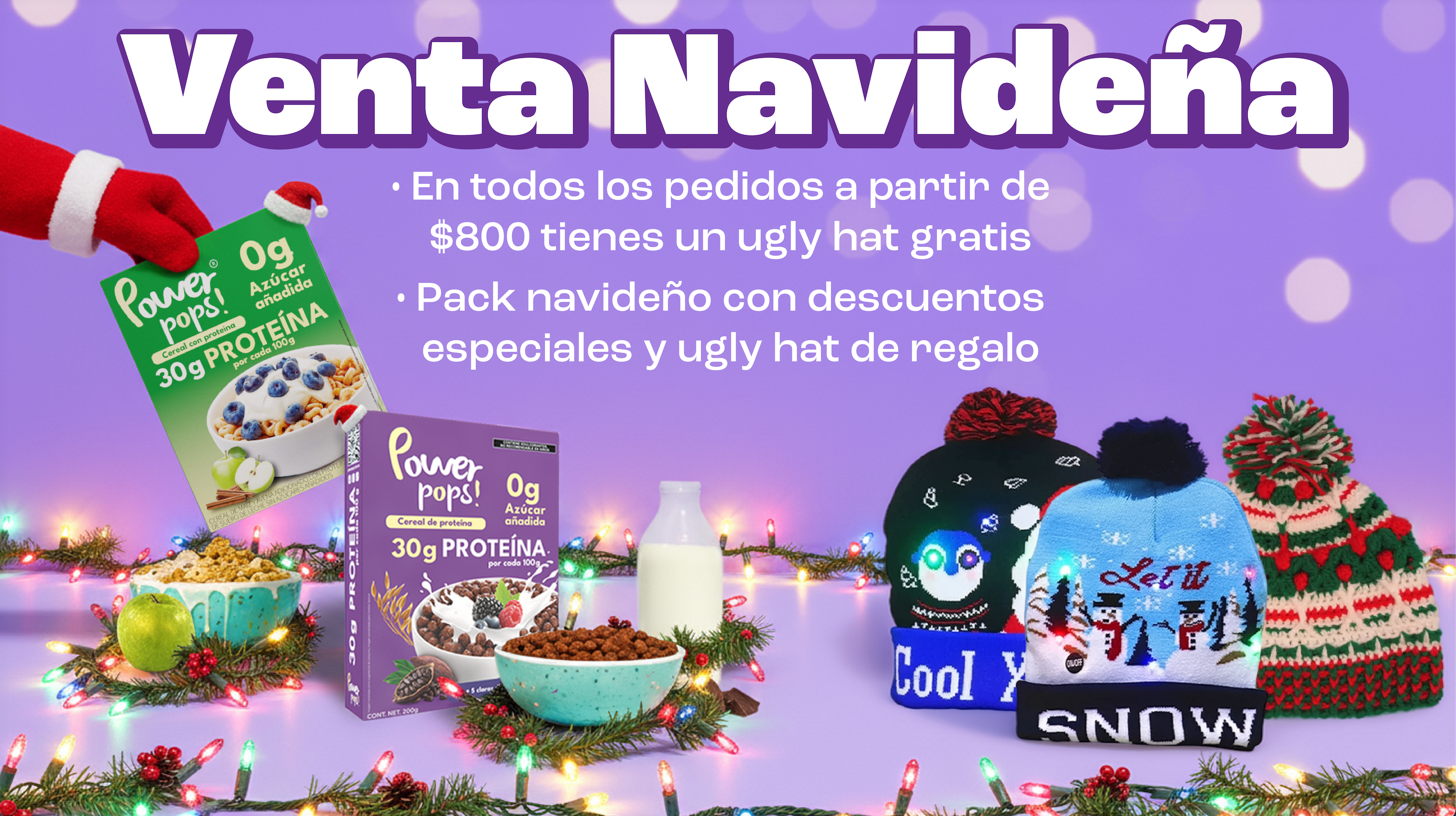 Pack Navideño 6 Power pops! + 6 ¡Mucha Proteína! y 1 UGLY HAT luces LED + 1 cuchara tornasol de Regalo + Envío gratis