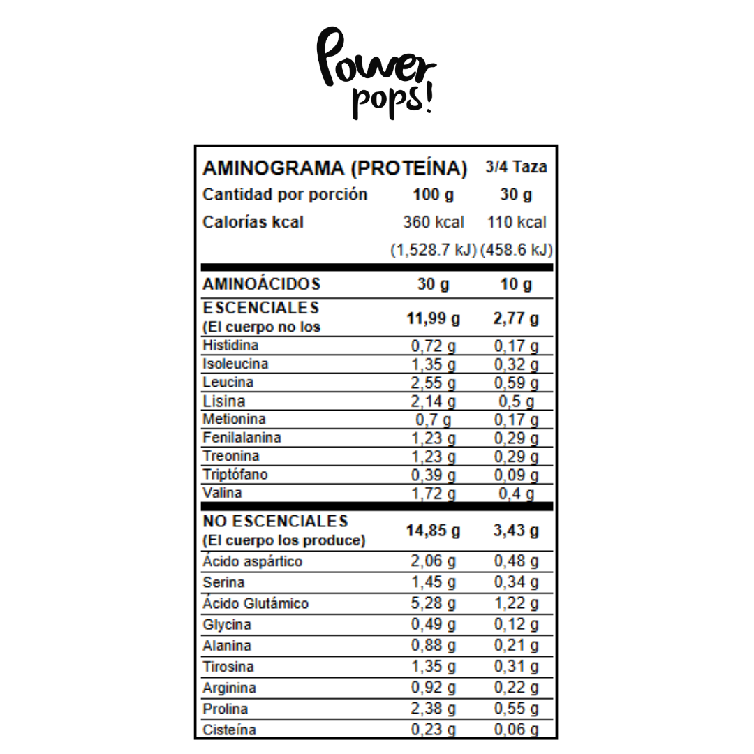 Power pops! contiene los 18 aminoácidos que tu cuerpo requiere para su desarrollo diario. Sin azúcar. Sin grasas. Sin sellos.